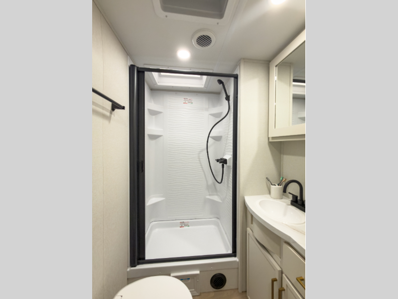 Sleeps 2 Slides 1 Length 33 ft 11 in Ext Width 8 ft Ext Height 11 ft Int Height 6 ft 6 in Hitch Weight 720 lbs GVWR 8800 lbs Dry Weight 7166 lbs Fresh Water Capacity 56 gals Grey Water Capacity 78 gals Black Water Capacity 39 gals Tire Size ST225/75R15LRE Furnace BTU 35000 btu Available Beds Queen Refrigerator Type 12V French Door Refrigerator Size 10.7 cu ft Convection Cooking Yes Cooktop Burners 3 Number of Awnings 1 LP Tank Capacity 20 lbs Water Heater Type Furrion Tankless AC BTU 15000 btu Cargo Deck Size 0 ft TV Info LR 32" TV Awning Info 17' Power w/LED Light Axle Count 2 Washer/Dryer Available Yes Number of LP Tanks 2 Shower Type Walk-In Shower Electrical Service 50 amp Solar Wattage 200 watts Similar Floorplans